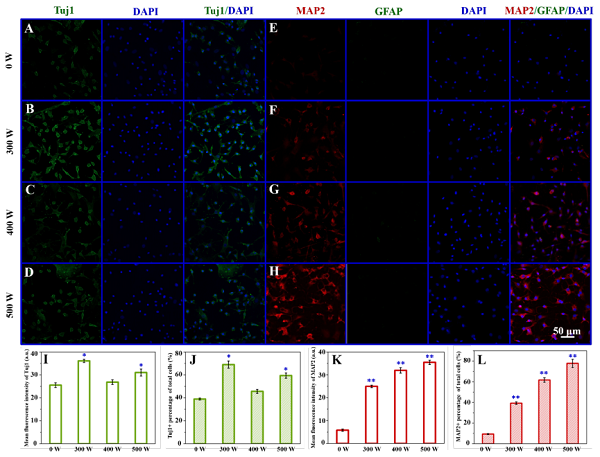 图5 PVDF纳米柱阵列不同无线电信号刺激强度培养21天时rBMSCs中神经特异性标记物的免疫荧光染色。细胞核为蓝色,绿色为Tuj1或GFAP,红色为MAP2。Tuj1(I)和MAP2(K)的平均荧光强度的统计分析。分化后细胞群中Tuj1阳性细胞(J)和MAP2阳性细胞(L)细胞的百分比。(*р≤0.05,**р≤0.01,n = 4)。