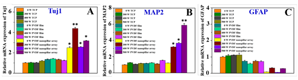 图4 不同无线电信号刺激强度下rBMSCs的神经分化。培养21天后,分别对神经特异性基因(A)Tuj1、(B)MAP2和(C)GFAP的表达量进行qPCR分析。(*р ≤ 0.05, **р ≤ 0.01, n = 3)。