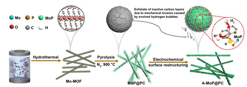 近年来,应用于可再生能源的先进材料的发展引起了越来越多的研究关注。氢作为一种储量丰富的清洁可再生能源载体,在可持续能源和工业化工体系中发挥着重要作用。电化学水分解制氢是一种能量转化率高、环境友好的制氢技术。开发高性能、低成本的电催化剂是解决当前能源危机的理想方法。到目前为止,过渡金属磷化物(TMPs)已经被广泛作为活性和低成本的析氢反应(HER)电催化剂。在现有的众多TMPs中,磷化钼(MoP)因其固有的催化性能而显示出巨大的应用潜力。然而,由于在强酸性或碱性介质中电导率差、条件恶劣,以及电催化中过高的过电位导致腐蚀、团聚或氧化,TMPs的性能很难达到最大化。因此,在恶劣条件下保持TMPs的高稳定性并同时增强其活性是一个关键的挑战。最近,用稳定的碳层包覆过渡金属纳米颗粒成为一种设计活性和耐用催化剂的新策略。超薄石墨烯外壳可以促进电子从被封装金属转移到石墨烯表面,优化石墨烯表面的电子结构,激发惰性石墨烯表面的催化活性。金属芯与碳层的协同效应与碳层的厚度密切相关。密度泛函理论(DFT)对碳层厚度对其性能影响的计算表明,当碳层数大于3时,碳壳表面不太可能被激活。然而,碳层的厚度难以控制,覆盖活性材料的碳层往往太厚,这可能会降低其催化活性。