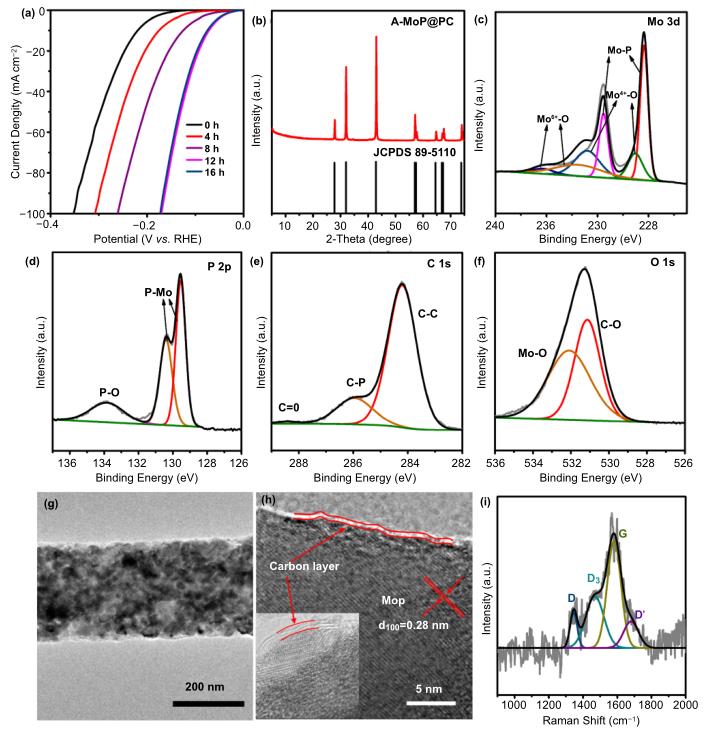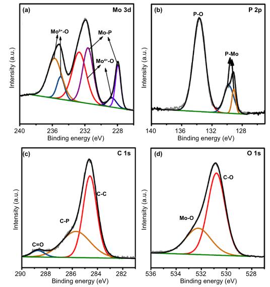 c-f. 对A-MoP@PC的 Mo 3d、P 2p、C 1s和O 1s的高分辨率XPS进行了研究;
