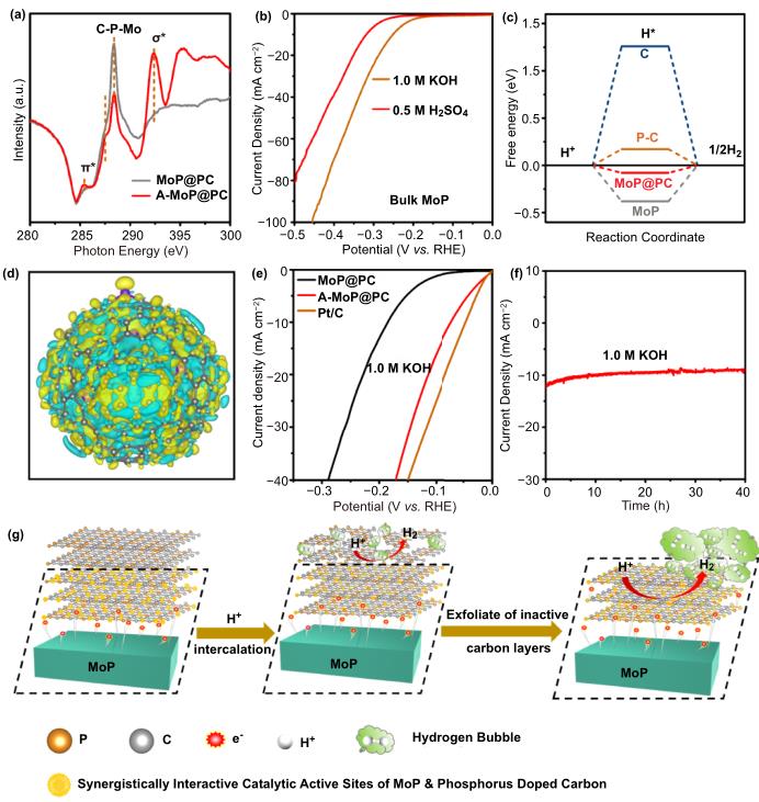 本文通过Mo-MOF前驱体的热解,再经过简单的电化学循环处理,合成了一种新型掺杂磷碳包覆磷化钼(A-MoP@PC)电催化剂。金属节点/有机配体在MOF中的原位转变导致高分散的MoP被磷掺杂碳保护。在电化学过程中,由于内部的MoP具有更强的电子逃逸能力,电子从碳层流向外表面,扩大了MoP在薄碳层上的吸附范围。结果表明,CV法可以逐渐去除多余的非活性碳壳,当活性表面碳暴露时,电催化剂会发生结构重组。活性炭表面不仅提高了催化活性,同时也增强了催化剂的耐久性。DFT计算结果表明,石墨烯表面的电子密度和电子势分布是由MoP芯的电子穿透引起的。封装的MoP核就像心脏一样将电子泵入碳壳层;极化碳层的富电子特性使活性位点增加,显著降低ΔGH*。电子调制结构的这些优点为HER提供了68 mV和67 mV的低过电势,允许它在0.5 M H2SO4和1.0 M KOH中分别达到10 mA cm−2的电流密度。该策略有助于设计高性能的HER电催化剂,为开发耐用的电化学催化剂提供了一种有前景的方法。