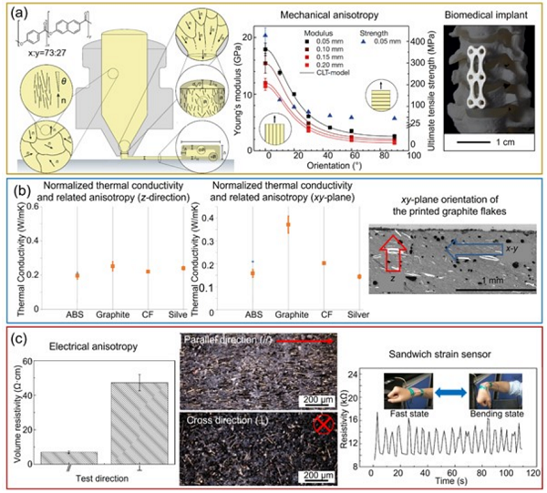 图2 FFF中的剪切诱导取向方法。(a) 具有核壳多级结构的液晶聚合物材料,(b)石墨片复合材料的传热各向异性,(c) 碳纤维/硅橡胶复合材料不同方向的体积电阻率(左),碳纤维在复合材料中的分布(中),以及该复合材料应用于应变传感器(右)。(注:图中参考文献出处请参见原文)