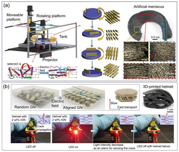 图4 VP中电场诱导取向方法。(a)电场辅助3D打印平台示意图(左)、MWCNTs方向的调控(中)和仿生半月板(右),(b)电场中GNs取向的示意图(左上),3D打印头盔的照片(右上),以及使用打印智能头盔的可穿戴传感器应用(下)。(注:图中参考文献出处请参见原文)