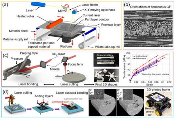 SL是一种结合增材和减材工艺将薄材进行叠加组合的制造技术,包括叠层实体制造(LOM)和基于复合材料制造(CBAM)技术。通过将预浸料片进行沉积、粘合,然后用激光或刀裁剪成既定形状。由于薄板粘接的组合方法,SL打印的零件具有本征的各向异性特征,且该技术为除了FFF以外的另一种能够制造连续纤维复合材料的工艺。LOM的各向异性程度可通过对含有定向排布纤维的薄材进行特定组合。