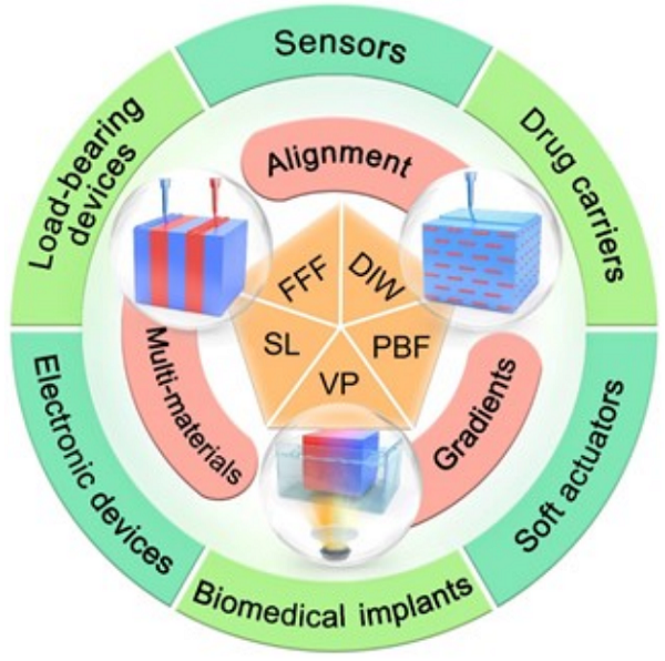 图1. 各向异性聚合物功能材料3D打印技术(中心)、实施策略(中间层)和应用(外层)概述