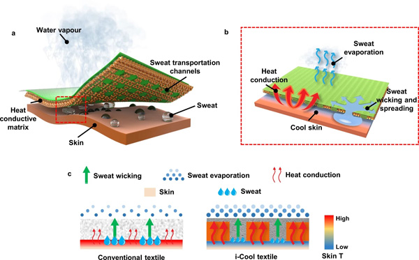 b, i-Cool纺织品的工作机制示意图。