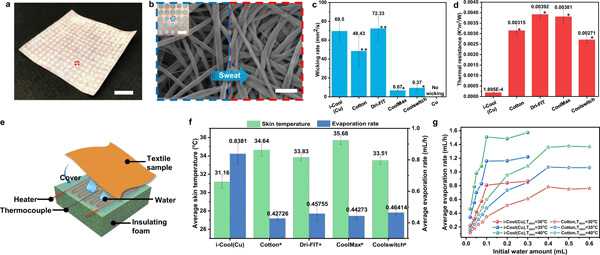 图2 i-Cool (Cu) 纺织品的芯吸性能、耐热性和瞬态液滴蒸发测试