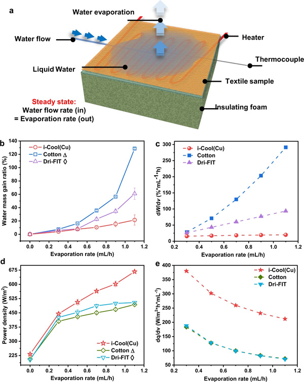 e,在稳态蒸发测试中,i-Cool (Ag)和其他纺织品在不同蒸发率下测量的功率密度。
