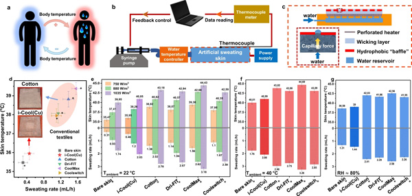 f,通过反馈控制回路在人工排汗皮肤平台上测量i-Cool (Ag)纺织品的皮肤温度和排汗率。