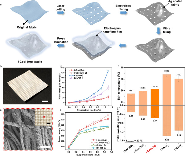 a,基于市售织物的 i-Cool (Ag) 纺织品的制造过程示意图。