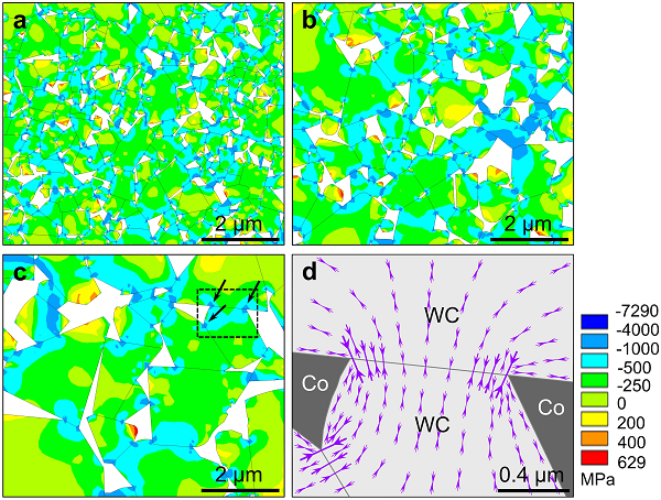 图3 不同WC平均晶粒尺寸的硬质合金样品中金属相的最大主应力云图:(a) 0.45 μm, (b) 0.80 μm, (c) 1.80 μm以及最大主应力方向分布(d)。