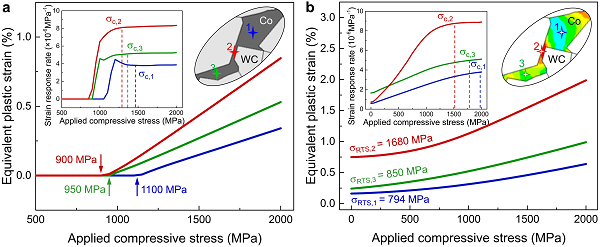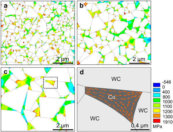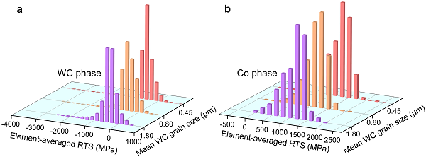由于粉末冶金制备的硬质合金中残余热应力实际上是无法避免的,利用材料微观组织结构的特征调控制备态残余热应力的分布状态,对后续材料在服役过程中对外加载荷的力学响应以及材料体现的力学性能至关重要。该项工作通过对制备态残余热应力与外加应力之间相互作用的系统计算,指出:在一定压缩载荷下,减小陶瓷相晶粒尺寸、降低金属粘结相薄层的分布比例、增加三叉界面的体积分数,是调控制备态残余热应力、同步实现硬质合金强韧化的有效途径。