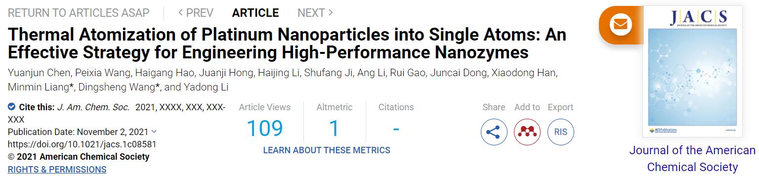 文献链接:Thermal Atomization of Platinum Nanoparticles into Single Atoms: An Effective Strategy for Engineering High-Performance Nanozymes. J. Am. Chem. Soc., 2021, DOI: 10.1021/jacs.1c08581.