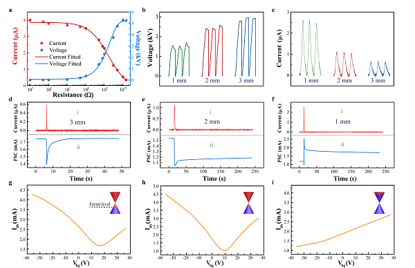 图2 基于GIG技术的单层石墨烯器件的输出特性。 a 不同负载下TENG的电学输出特性;三种不同放电距离的正电晕放电电压b和电流c曲线,放电距离分别为1、2和3 mm;d-f 不同放电距离下正电晕放电的电流-时间曲线(i)和人工突触在不同放电距离下的PSC-时间曲线(ii);g-I 不同放电距离下放电调控后石墨烯器件的转移特性曲线。