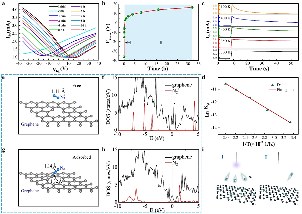 图3 N2+离子在石墨烯表面的吸脱附特性。 a d=1 mm时放电调控后转移特性曲线随时间的变化;b VDirac 随时间的恢复过程;c 在不同温度下调控器件的电流-时间曲线;d lnKd和1/T 之间的线性关系;e-h N2+离子吸附在石墨烯碳空位之前和之后的碳晶格结构和态密度;i 在有缺陷石墨烯的不同位点吸附 N2+离子的不同行为。