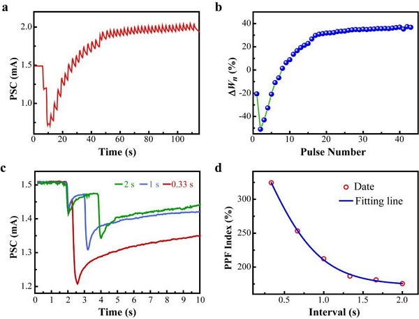 图4 人工突触在多次脉冲刺激下的特性。a PSC随脉冲数增加的变化曲线;b ΔWn随脉冲数增加的变化;c PSC在成对脉冲调控下随时间变化曲线;d PPF指数随时间间隔变化曲线。