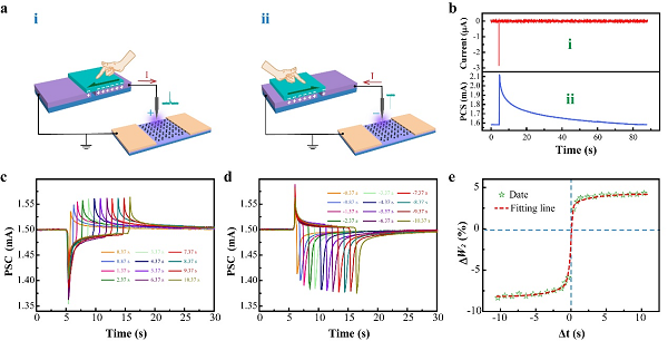 图5 人工突触对机械信号的感知和转换。 a 系统接收不同机械信号示意图;b d=3 mm时负电晕放电的电流-时间曲线(i)和人工突触的PSC-时间曲线(ii);c-d 在交替的正电晕和负电晕放电下,PSC随时间的变化曲线;e 权重变化率ΔW2和脉冲间隔Δt 之间的关系。