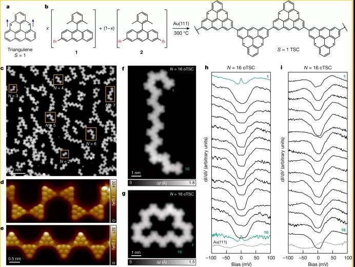来自德国德累斯顿工业大学和马普微结构物理研究所的冯新亮、瑞士联邦材料科学与技术实验室的Pascal Ruffieux、葡萄牙国际伊比利亚纳米技术实验室的Joaquín Fernández-Rossier课题组,采用表面合成的方法制备了一维含S=1多环芳香烃三角烯的自旋链。利用扫描隧道显微镜和4.5 K下的光谱,在原子尺度上探测了开放自旋链和循环自旋链中长度依赖的磁激发,并直接观察到其中的间隙自旋激发和分数阶边态。精确的对角化计算提供了决定性的证据,证明自旋链在Haldane对称保护拓扑相中是由S=1双线性-双二次哈密顿量描述的。相关论文以题为“Observation of fractional edge excitations in nanographene spin chains”发表在Nature上。