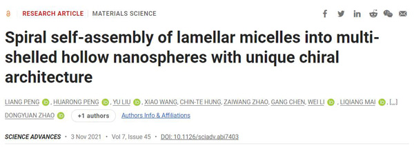 文献链接:Spiral self-assembly of lamellar micelles into multi-shelled hollow nanospheres with unique chiral architecture(Sci. Adv.,2021,DOI:10.1126/sciadv.abi7403)