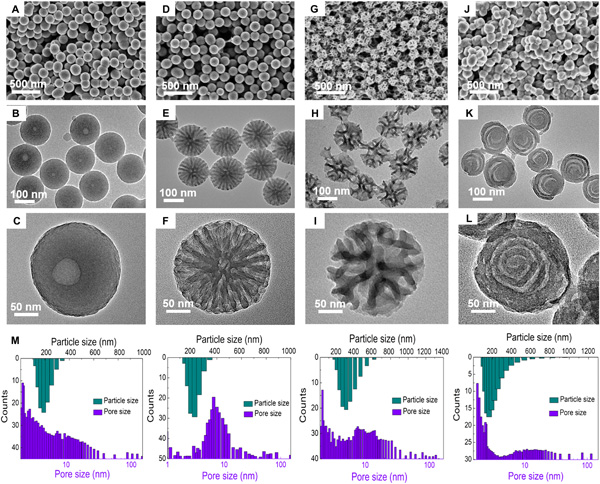 (A~L)通过使用不同的Pluronic三嵌段共聚物调整胶束的界面曲率制备的介孔碳纳米球的FESEM和TEM图像:(A~C)F108,(D~F)F127,(G~I)P105,和(J~L)P123。