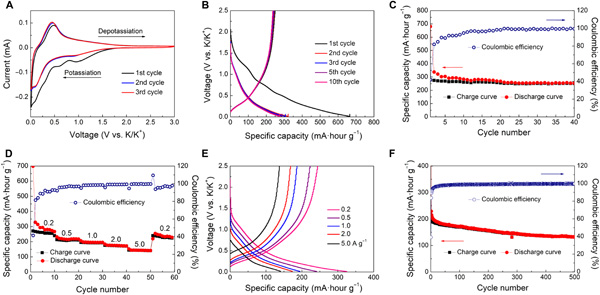 综上所述,采用层状胶束螺旋自组装方法制备了具有良好孔隙率和独特手性结构的均匀MCN。该方法的特点是引入剪切流来驱动层状胶束连续自组装成稳定的螺旋状多壳纳米球。此外,通过控制表面活性剂的疏水/亲水比例,可以按需系统地调节胶束结构,从而形成从单孔、径向、花状到多壳纳米球的可控介观结构。结果表明,合成的螺旋MCNs粒径小(~150 nm),比表面积大(~530 m2 g−1),孔体积大(~1.0 m3 g−1),N含量高(~6.2 wt %),壳厚(~13 nm),具有前所未有的手性结构。另外,MCN对KIBs具有良好的倍率性能(在5 A g−1时为134 mA·h g−1)和长期循环稳定性(500次循环后在2 A g−1时为112 mA·h g−1)。因此,这项工作不仅提供了一个多功能平台,为先进的应用合成新型纳米结构,而且还提供了关于胶束定向自组装和化学的新基础知识。