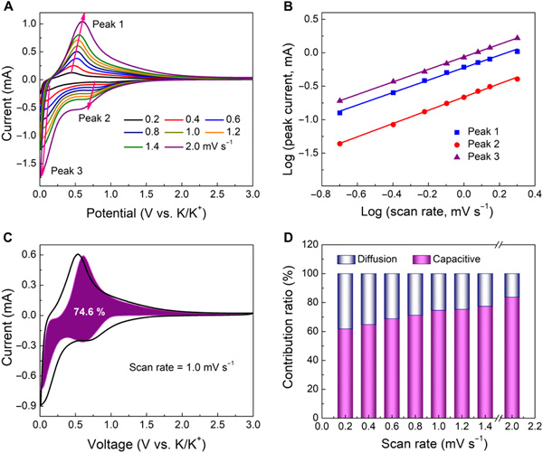 (D)电容和扩散控制的电荷与不同扫描速率的贡献比。