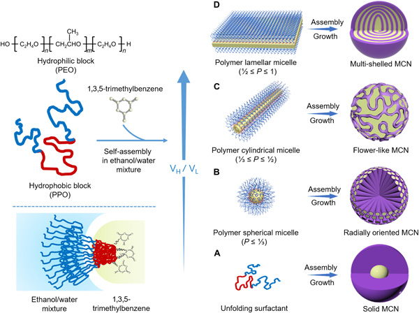 近日,在复旦大学赵东元院士团队等人带领下,报告了一种层状胶束螺旋自组装策略来合成独特手性的多壳介孔碳纳米球。该合成方法与传统的手性模板方法不同,其特点是引入剪切流来驱动螺旋自组装。此外,不断调整表面活性剂的两亲性可以引起堆积参数的变化,即胶束结构的转变,从而形成从单孔、径向定向、花状和多壳结构的不同孔隙结构。这些多壳碳纳米球的自支撑螺旋结构,结合其高的比表面积(~530 m2 g−1)、丰富的N含量(~6.2 wt%)和丰富的介孔(~2.5 nm),使其具有良好的电化学性能,可存储钾离子。这种简单而强大的胶束定向自组装策略为未来功能材料的纳米结构设计提供了灵感。该成果以题为“Spiral self-assembly of lamellar micelles into multi-shelled hollow nanospheres with unique chiral architecture”发表在了Sci. Adv.上。