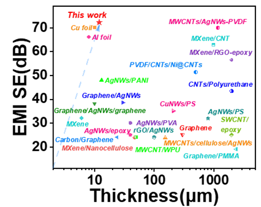 该成果以题为“Electromagnetic Interference Shielding Material for Super-broadband: Ultrathin, Sandwich Structure Multi-Walled Carbon Nanotube/Silver Nanowire Film”在J.Mater.Chem.A期刊发表,文章第一作者为中国科学院山西煤炭化学研究所研究生王正。