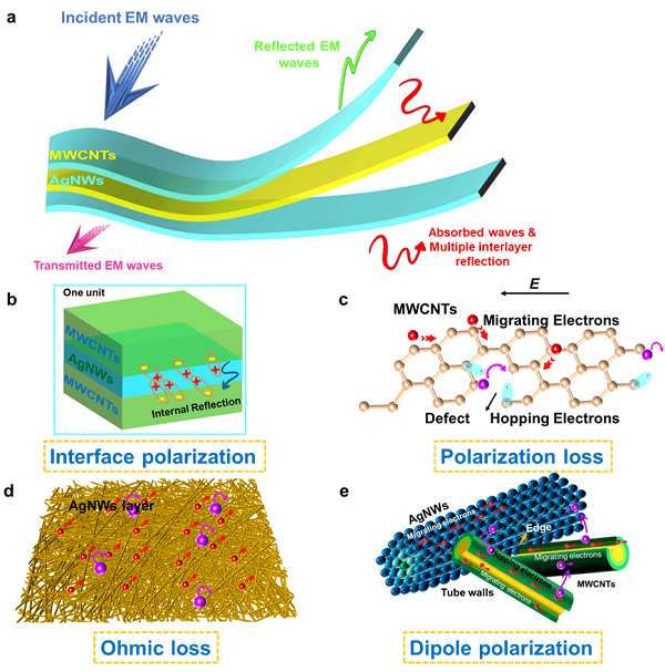 近日,中国科学院山西煤炭化学研究所姜东研究员与陈成猛研究员(共同通讯作者)等人通过层层自组装的方法利用多壁碳纳米管 (MWCNT) 和银纳米线 (Ag NW) 构建夹层薄膜(12 μm)。在超宽带(4-40 GHz)中,总屏蔽效能均高于45 dB,最高在10 GHz高达72 dB。这种出色的屏蔽性能可归因于交替插层的Ag NWs/MWCNTs结构设计,其中具有高电导率的 Ag NWs提供欧姆损耗,而具有丰富缺陷的MWCNTs贡献极化损耗。这种结构改善了薄膜整体的阻抗匹配,并通过MWCNTs层和Ag NWs层之间的宏观界面增强了多次反射吸收,贡献界面极化。此外,DFT 计算验证了 Ag/C 微界面的存在会导致电荷分布不均匀,从而导致偶极极化。考虑到实际应用,该薄膜在复杂环境(热、冷、弯曲)下仍保持优异的电磁屏蔽性能和散热性能。这项工作为开发超宽带电磁屏蔽材料以应对复杂多变工作环境提供了更加新颖的解决方案。