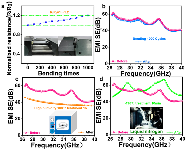 图8 (a) Ag/C-7L 薄膜在1000次弯曲前后的归一化电阻变化情况。 七层薄膜在极端条件下的屏蔽性能保持,包括 (b)1000次弯曲过程、(c)100°C 高温和(d)液氮中超低温处理后的变化。