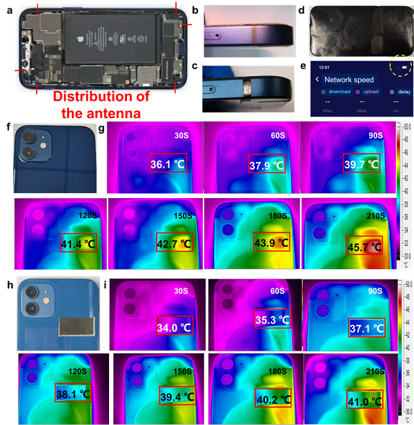 图9 (a)5G苹果手机天线的分布。(b-d) Ag/C-7L薄膜覆盖前后的数码照片。 (e) 示意图处信号被完全屏蔽。(f-i)cpu运行工作时间(30、60、90、120、150、180 和 210 秒)内样品的红外热成像图像。