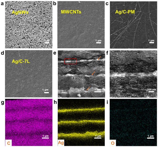 图2. (a)Ag NWs薄膜、(b) MWCNTs薄膜 (c) Ag/C-PM薄膜和 (d) Ag/C-7L薄膜的表面扫描电子显微镜图像。 (e) Ag/C-7L薄膜的截面扫描电子显微镜图像。 (f)高放大倍数下截面扫描电子显微镜图像和 (g-i) Ag/C-7L薄膜的元素分布图。