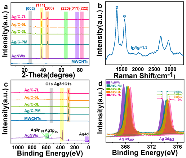 图3. (a) 所有样品的XRD光谱和 (b)多壁碳纳米管的拉曼光谱。 (c)所有薄膜的XPS光谱。 (d) Ag 3d峰的高分辨率XPS光谱。