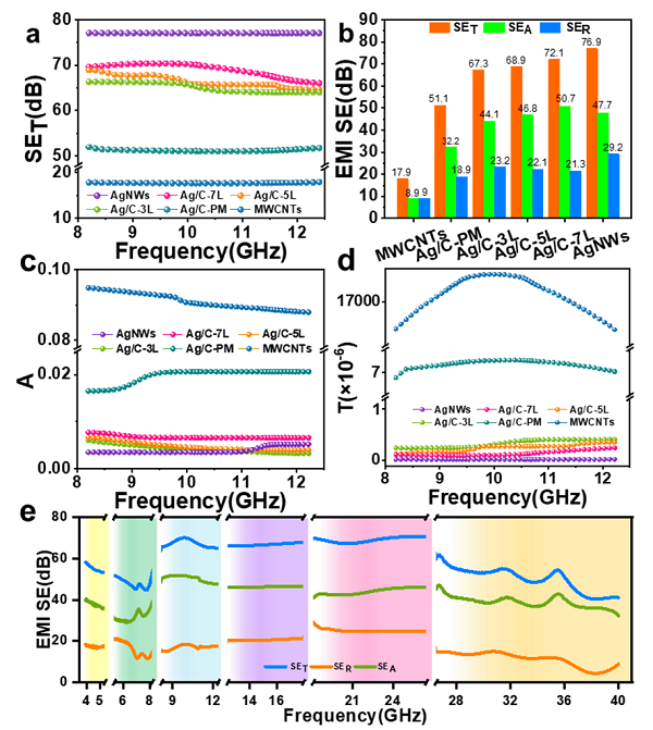 图4. (a) X波段复合材料的SET。 (b)X波段复合材料的SET、SEA和SER。 (c)所有薄膜的吸收系数(A)和(d)透射系数(T)。 (e) Ag/C-7L 薄膜在C波段、X波段、Ku波段、K波段和Ka波段的屏蔽性能。