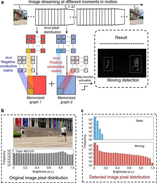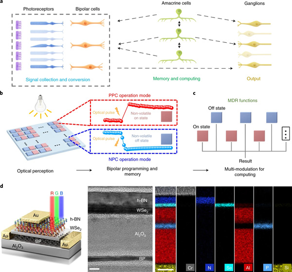 运动检测和识别(MDR)已经成为智能家居、人工视觉、安全监控、无人驾驶汽车和军事防御等多种智能场景的核心需求。目前最先进的MDR硬件系统由互补金属氧化物半导体(CMOS)图像传感器(CIS)平台主导,它由独立和冗余的像素传感阵列、模拟数字转换器、存储器和处理模块组成。然而,传统的CIS芯片需要大量的附加块和不同模块之间复杂的数据转换、传输、存储和处理操作,而先进的智能应用则追求便携性和效率。人类视网膜在获取运动信息方面具有很高的效率,各功能层的神经元和突触细胞在视觉信号的感知、转换、传输和提取方面发挥着明显的作用。视网膜通过整合高级视觉系统的信号感知、记忆和处理,消除了冗余和无用的视觉输入处理,极大地加快了运动目标特征的提取和检测。目前,受视网膜启发的视觉传感器正在兴起,其功能材料包括记忆氧化材料、2D材料及其异质结构。特别是,2D材料的电导率对外部光学刺激敏感,这使它能够感知光学信息,并将其转换为电信号进行传输和处理,类似于视网膜。与分立的CIS模块相比,视觉传感器具有集成的光学信号感应和计算能力,用于静态图像处理。然而,除了静态图像外,具有记忆能力的视网膜还显示出时间上的区分功能,这使得它们能够感知静态和移动目标。没有记忆能力的视觉传感器不能提取和处理运动信息,仍不是真正的视网膜形态硬件。简而言之,目前的视网膜模拟技术仅限于初级静态图像处理,而基于紧凑高效器件的高级复杂运动特征提取和检测仍未探索。