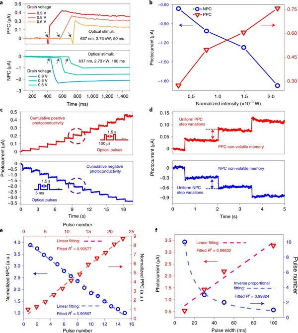 d,c中虚线处放大视图,将多态PPC和NPC的增量定义为PPC/NPC步长;均匀的PPC和NPC阶跃变化进一步证明了光电流的非易失性和出色的线性度。