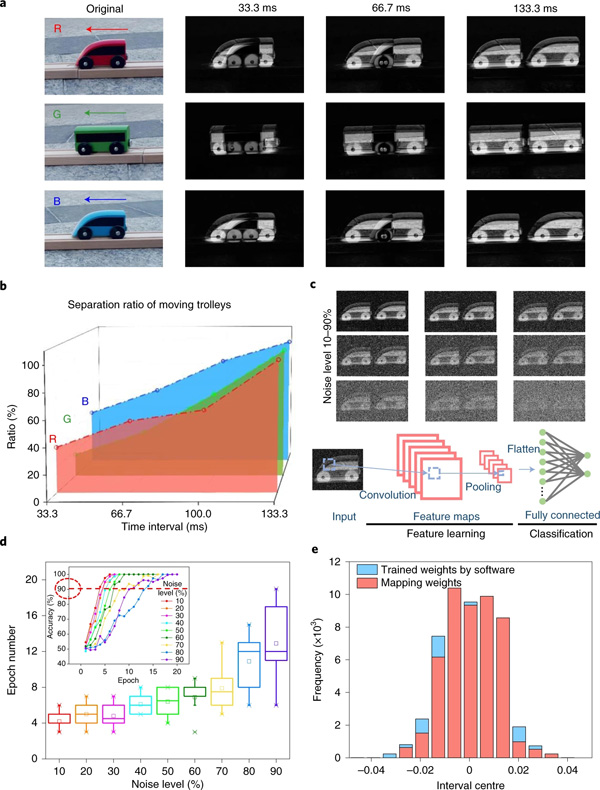 e,软件训练和2D视网膜器件映射后的权重分布,其中一致的权重映射可以成功识别检测到的移动手推车。