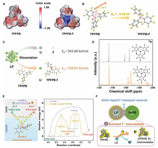 在密度泛函理论(DFT)方法的基础上,用静电势(ESP)分析了TPFPB分子的电荷分布(图2A)。TPFPB有一个缺电子的硼中心(鲜红色区域),它对结合能为−3.39 eV的富电子氟具有很强的吸引力(图2B)。具有F结合亲和力的TPFPB通过形成TPFPB-F复合物有利地促进LiF裂解,因此能够显著降低的解离能 (图2C)。为了进一步表征溶剂化的[TPFPB-F]−中间体,本文以纯净的TPFPB为对照,进行了核磁共振和傅里叶变换红外光谱测试。在19FNMR谱(图2D)中,有一个信号出现在高场区域,在TPFPB-LiF/二甲醚的情况下,化学位移(δ)为百万分之192.2。