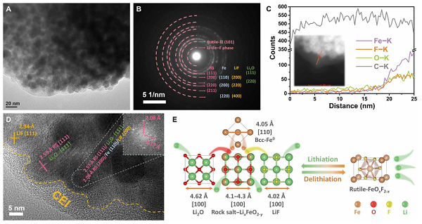 FeO0.3F1.7放电到1.2V后,光对比矩阵(图5A)中均匀嵌入了大量的暗对比度纳米颗粒,从暗场图像的颜色对比度(图5C)也可以看出这一点。这些纳米畴呈方形,均匀尺寸约为10 nm,与立方岩盐、LiF和Fe相的可能产物相一致。SAED图谱证实了从原始金红石到这些立方结构的转变(图5B),包括氧缺陷的岩盐和通过充分的锂化反应挤出的Li2O相。根据图5D中的HRTEM图像,选择的暗对比度纳米畴的FFT图样显示了岩盐/Li2O相的(111)面,加上d间距为~2.08 Å的特征晶格条纹,对应于岩盐、Fe和LiF反射的潜在叠加。