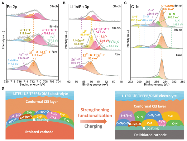 图6.循环FeO0.3F1.7在含TPFPB的电解液中的表面演化。