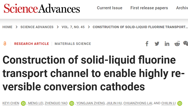 来自中国科学院上海硅酸盐研究所的李驰麟研究员提出了一种固液转化机制来激活TPFPB的氟阴离子受体实现的氟氧化铁的氟传输动力学。TPFPB通过在多相界面上形成溶剂化的F–中间体,从而促进惰性氟化锂的解离,并在多相界面上提供一个容易的氟传输通道。具有氟化阴极电解质界面的固液通道的构建是实现FeO0.3F1.7和FeO0.7F1.3可持续转化反应(能量效率接近80%)和高倍率性能(在2A/g时可逆容量为320mAh/g)的关键。在220W/kg和4300W/kg功率密度下,FeO0.3F1.7和FeO0.7F1.3的阴极能量密度分别达到1100Wh/kg和700Wh/kg。相关工作以题为“Construction of solid-liquid fluorine transport channel to enable highly reversible conversion cathodes”的研究性文章在《Science Advances》上发表。