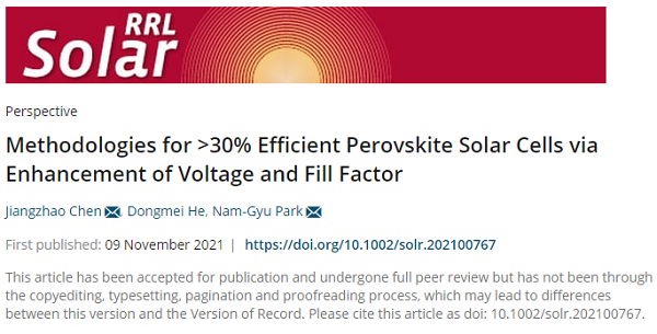 Jiangzhao Chen#*, Dongmei He#, and Nam-Gyu Park*. Methodologies for >30% efficient perovskite solar cells via enhancement of voltage and fill factor. Solar RRL 2021, DOI:10.1002/solr.202100767. 链接:https://onlinelibrary.wiley.com/doi/abs/10.1002/solr.202100767