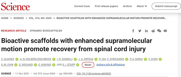 文献链接:“Bioactive scaffolds with enhanced supramolecular motion promote recovery from spinal cord injury”(Science,2021,10.1126/science.abh3602)