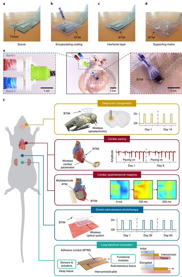 灵活的电子/光电系统可以紧密地集成到重要器官系统的表面,有潜力提供与广泛的疾病和紊乱相关的革命性诊断和治疗能力。这些技术与活体组织之间的关键界面必须提供软机械耦合和有效的光/电/化学交换。在这里,美国西北大学John A. Rogers、Yevgenia Kozorovitskiy联合乔治华盛顿大学Igor R. Efimov等人介绍了一种功能性粘附生物电子-组织界面材料,其形式为机械顺应性、导电性和光学透明封装涂层、界面层或支撑基体。这些材料与设备表面和不同内部器官的表面紧密结合,在几天到几个月的时间内具有稳定的粘附性,可以以可控的速率量身定制生物吸收。活体动物模型的实验演示包括设备应用,从用于脑深部光遗传学和真皮下光疗的无电池光电系统到无线毫米级起搏器和柔性多极心外膜阵列。这些进展可以立即应用于目前用于动物模型研究的几乎所有类型的生物电子/光电系统,它们也有潜力在未来治疗危及生命的疾病和紊乱。相关研究以“Photocurable bioresorbable adhesives as functional interfaces between flexible bioelectronic devices and soft biological tissues”为题目,发表在Nature Materials上。DOI: 10.1038/s41563-021-01051-x