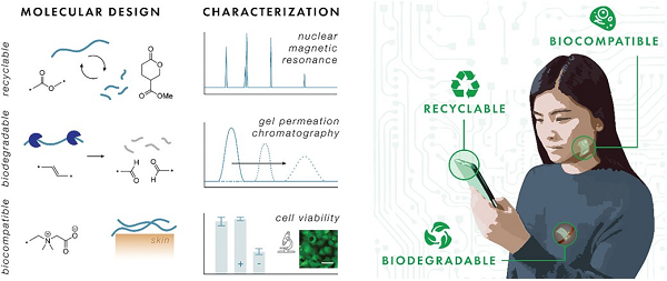 图5 下一代环保和人类友好的电子产品依赖于可回收、生物可降解和生物相容性聚合物的新兴分子设计和表征技术示意图