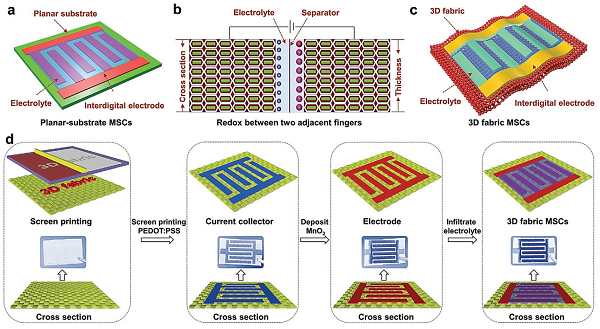 目前主要建立在平面基板上的微型超级电容器(MSC)虽然性能优越,但仍然存在面积电容有限的问题。鉴于此,南京邮电大学黄维院士和赖文勇等人引入了一种使用3D织物作为多孔骨架构建高截面MSCs的新策略。叉指聚(3,4-亚乙基二氧噻吩):聚(苯乙烯磺酸盐)(PEDOT:PSS)在3D织物上形成图案以实现连续的导电网络,而MnO2在PEDOT:PSS上外延生长的微球在织物纤维的支持下完全暴露在电解质中。独特的架构可以利用厚电极的更多活性位点和互穿纤维网络的高导电性。这些织物与可穿戴电子设备兼容,可以集成到用于便携式应用的小型化设备中。这种基于3D织物的MSC可能为通过结构设计和器件集成开发高性能MSC提供新途径。相关研究以“3D Wearable Fabric-Based Micro-Supercapacitors with Ultra-High Areal Capacitance”为题目,发表在AFM上。DOI: 10.1002/adfm.202107484