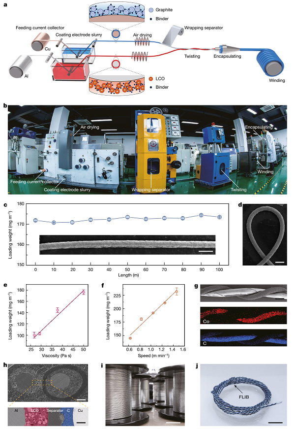 纤维锂离子电池(FLIB)作为一种灵活的电源解决方案很有吸引力,因为它们可以编织在纺织品上,为未来的可穿戴电子产品提供方便的供电方式。然而,它们的长度很难超过几厘米,而更长的纤维被认为具有更高的内阻,从而损害了电化学性能。复旦大学彭慧胜等人表明,这种纤维的内阻与纤维长度有一个双曲余切函数关系,它首先减少,然后随着长度的增加趋于平稳。系统研究证实,这种意想不到的结果适用于不同的纤维电池。通过优化的可扩展工业流程,能够生产数米高性能纤维锂离子电池。大规模生产的纤维电池的能量密度为每公斤85.69瓦时(典型值小于每公斤1瓦时),可为心率监测仪和血氧仪等商用可穿戴设备提供超过 2 天的续航。。经过500次充放电循环后,其容量保持率达到90.5%,1C倍率下的容量保持率达到93%(与0.1倍率容量相比),与袋式电池等商用电池相当。纤维弯曲10万次后,可保持80%以上的容量。研究展示了工业剑杆织机将纤维锂离子电池编织到安全且可清洗的纺织品中,可以无线给手机充电,或为集成了纤维传感器和纺织品显示器的健康管理夹克供电。相关研究以“Scalable production of high-performing woven lithium-ion fibre batteries”为题目,发表在Nature上。DOI: 10.1038/s41586-021-03772-0