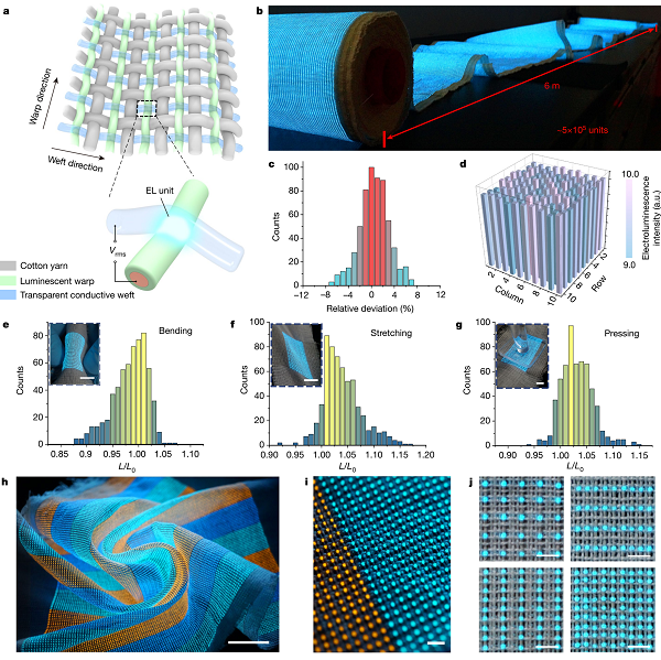 显示器是现代电子产品的基本组成部分。将显示器集成到纺织品中为智能电子纺织品提供了应用机会,这是可穿戴技术的最终目标,随时准备改变我们与电子设备交互的方式。展示纺织品起到了人机交互的桥梁作用,例如,为语音或言语有困难的人提供了实时交流工具。能够通信、传感和供电的电子纺织品以前曾被报道过。然而,具有大面积功能性展示的纺织品尚未实现,因为要获得既耐用又易于在大面积组装的小型照明单元具有挑战性。在这里,复旦大学彭慧胜、陈培宁团队等人报道了一个6 m长,25 cm宽的显示纺织品,包含5×105电致发光单元,间隔约800 um。编织导电经纱和发光经纱纤维,形成微米级电致发光单元。电致发光单元之间的亮度偏差小于8%,即使在纺织被弯曲、拉伸或挤压时也保持稳定。展示纺织品柔软透气,经得起反复机洗,适合实际应用。研究展示了一个由显示器、键盘和电源组成的综合纺织系统,可以作为通信工具,展示了该系统在包括医疗保健在内的各个领域的“物联网”中的潜力。我们的方法是将电子设备的制造和功能与纺织品结合起来,我们预计编织纤维材料将塑造下一代电子产品。相关研究以“Large-area display textiles integrated with functional systems”为题目,发表在Nature上。DOI: 10.1038/s41586-021-03295-8