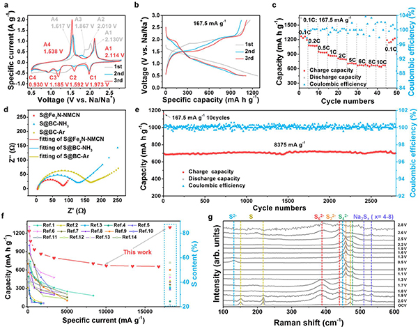 (h,i)S@Fe3N-NMCN和S@BC-NH3在167.5 mA g-1时的电压-容量曲线和以0.2 mV-1的扫数下的CV曲线。