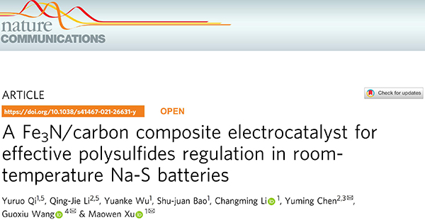文献链接:“A Fe3N/carbon composite electrocatalyst for effective polysulfides regulation in roomtemperature Na-S batteries”(Nature Commun.,2021,10.1038/s41467-021-26631-y)